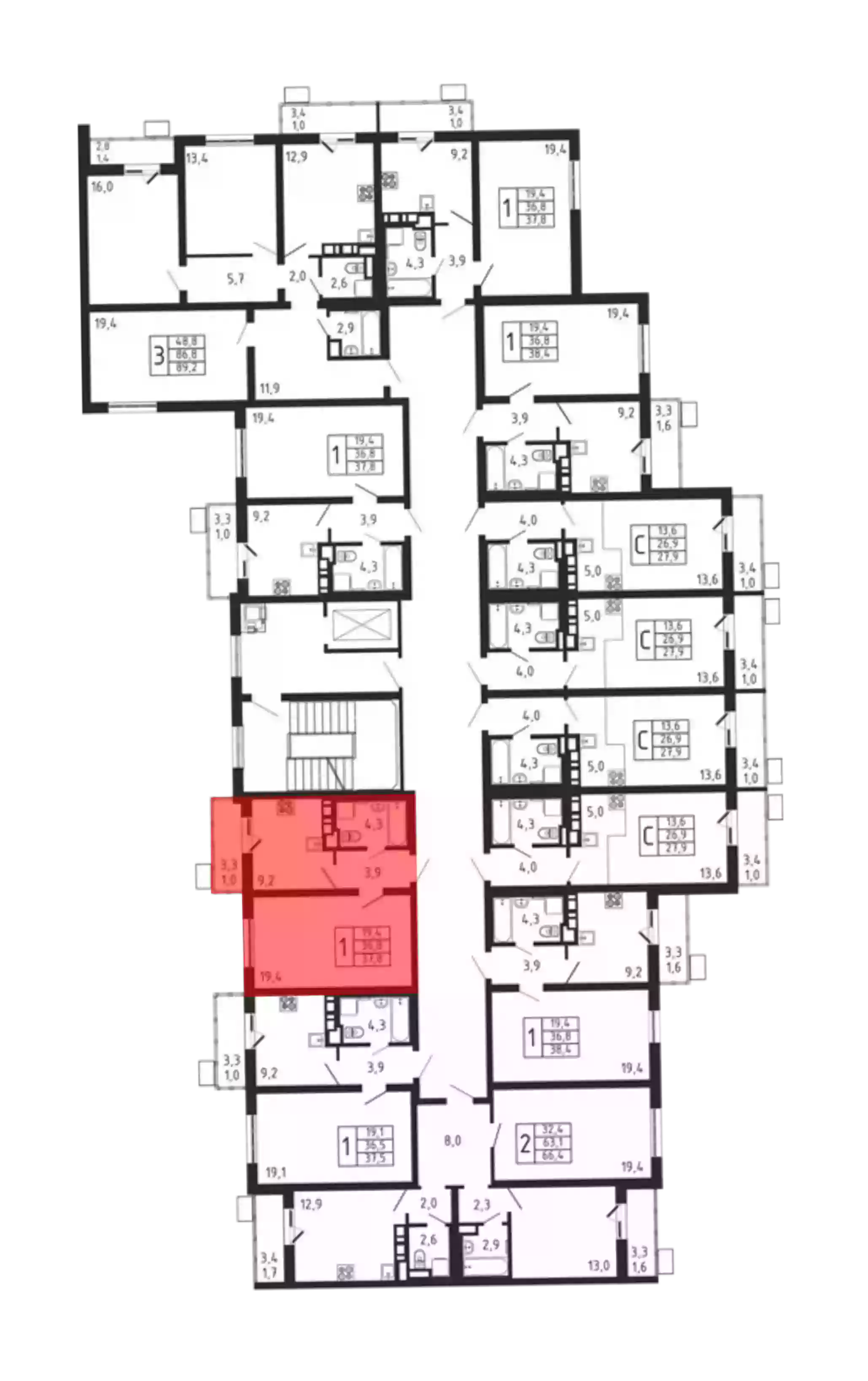 - Жилая площадь 19.4 м²