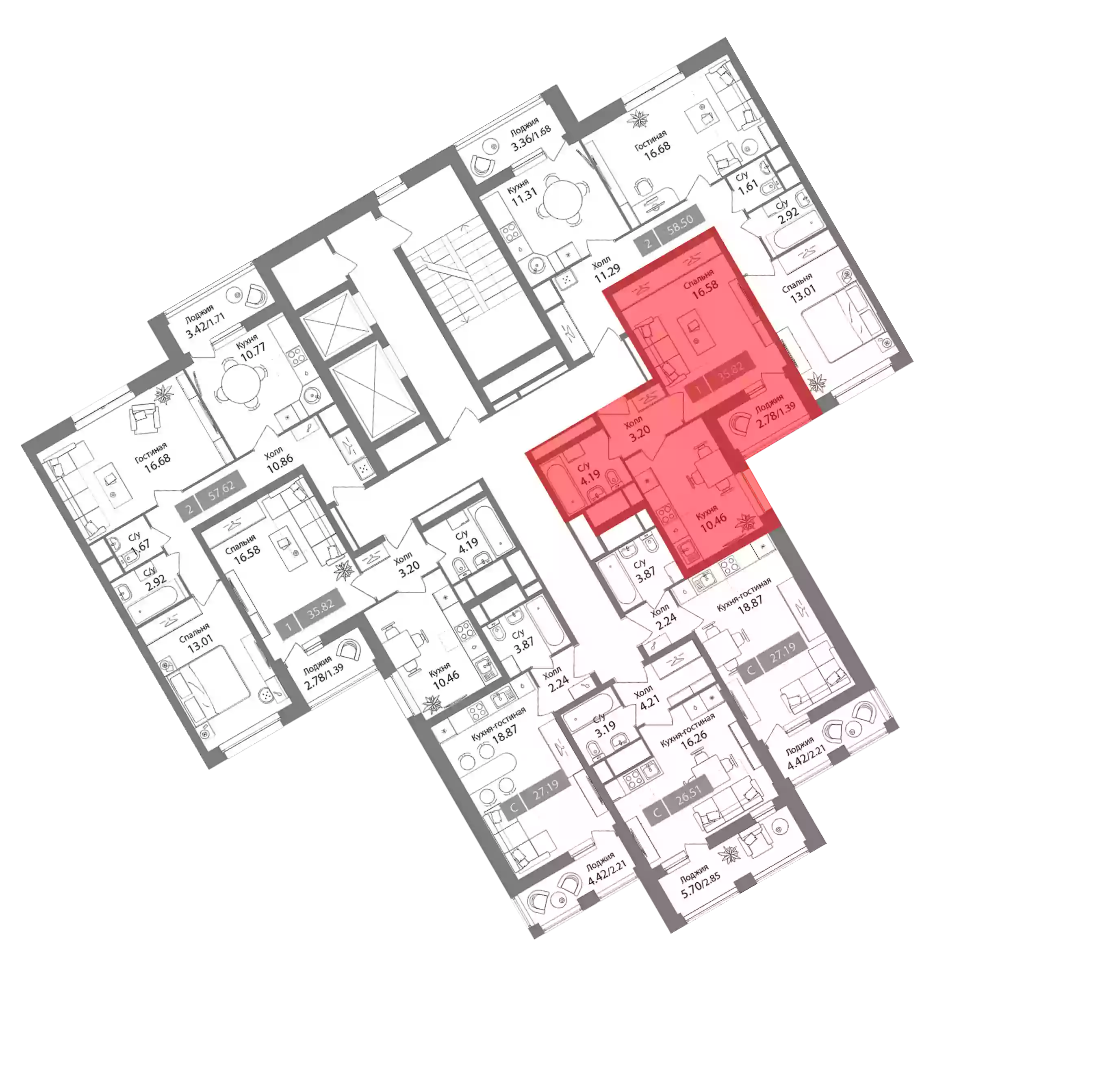 - Жилая площадь 16.58 м²
