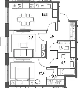• Площадь кухни 15.3 м²