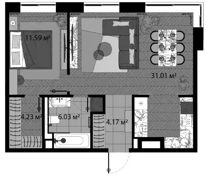 В комплексе предложен широкий выбор планировочных решений: от компактных студий площадью 22 кв. метра до просторных резиденций площадью 120 кв. метров. Планировками предусмотрены мастер-спальни с гардеробной и санузлом, просторные кухни-гостиные, гардеробные и системы хранения, выделенные рабочие зоны в спальнях и террасы с панорамным видом на город. Во всех квартирах панорамные окна и высокие потолки от 2,85 метра. Квартиры сдаются с отделкой White box.