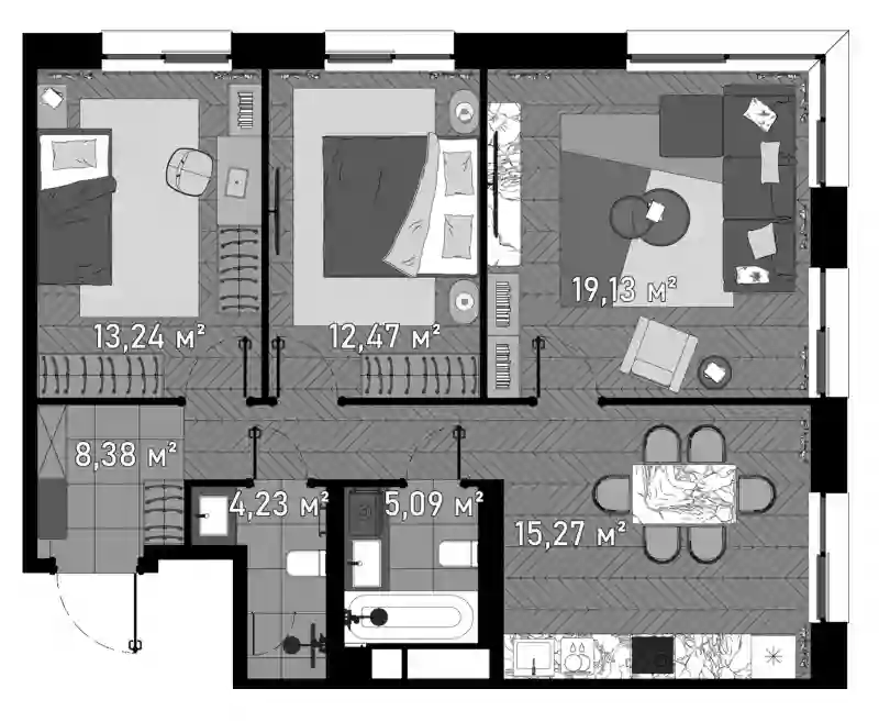В комплексе предложен широкий выбор планировочных решений от компактных студий до 4-х комнатных квартир евро-формата. В квартирах предусмотрены лоджии с чистовой отделкой и остеклением, а в планировках евро-формата два окна в кухне-гостиной. Квартиры сдаются как с отделкой White Box, так и с финишной дизайнерской отделкой в нескольких цветовых решениях. Во всех квартирах предусмотрена возможность установки интеллектуальной системы «Умная квартира».