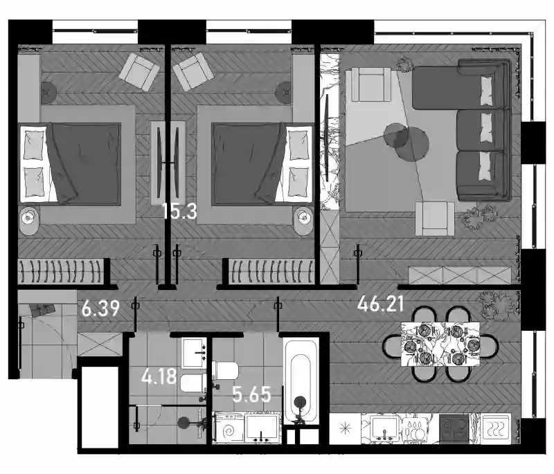 • Жилая площадь 15.3 м²