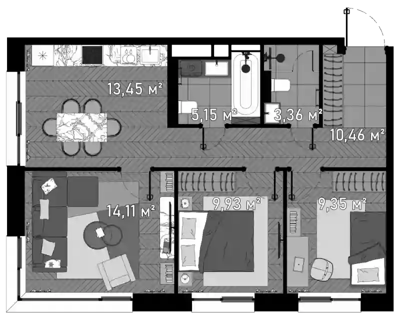 • Площадь кухни 13.45 м²